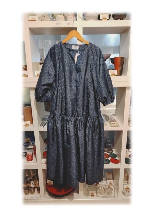 409 大島紬 キーネックワンピース 世界に1着のみ ローウェスト切り替え 着物リメイク 青系 ゆったりサイズ