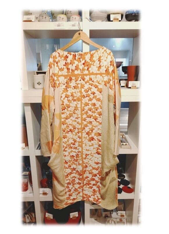 416 1着のみ ゆったりしたワンピース コクーンワンピース 正絹着物リメイク シルク オレンジ系 3種類の着物地 小花柄