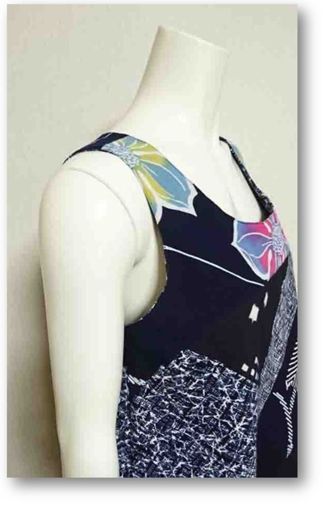 色々な浴衣地をパッチワークし、斜めに配置たAラインのワンピース。