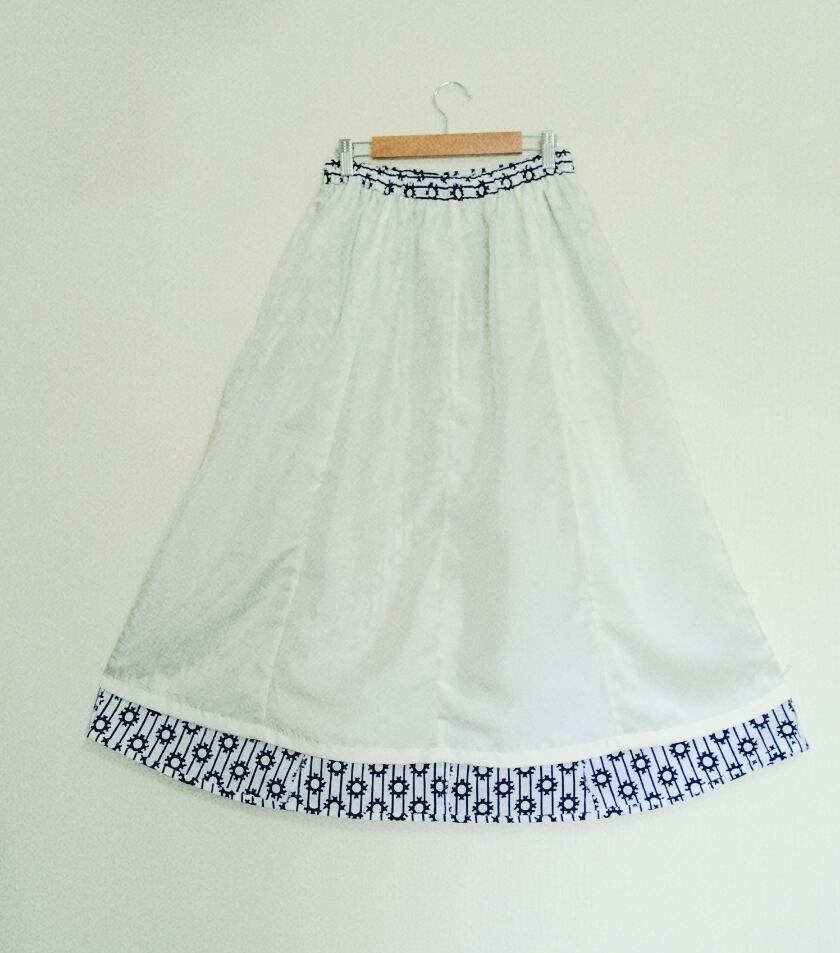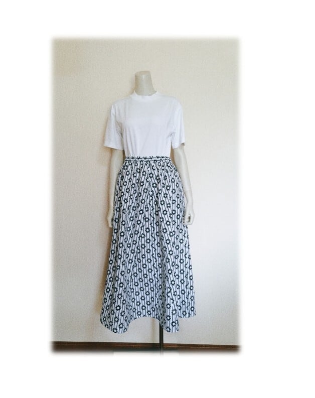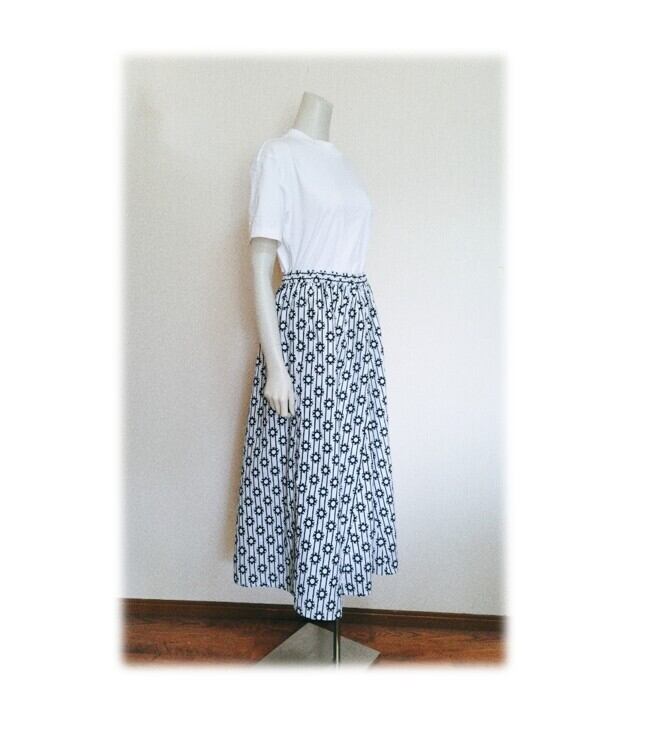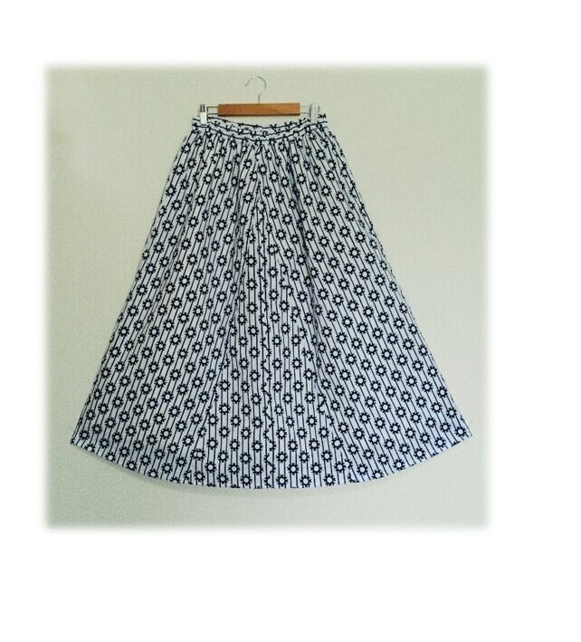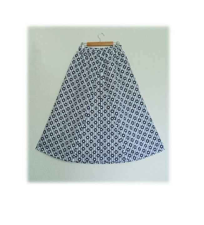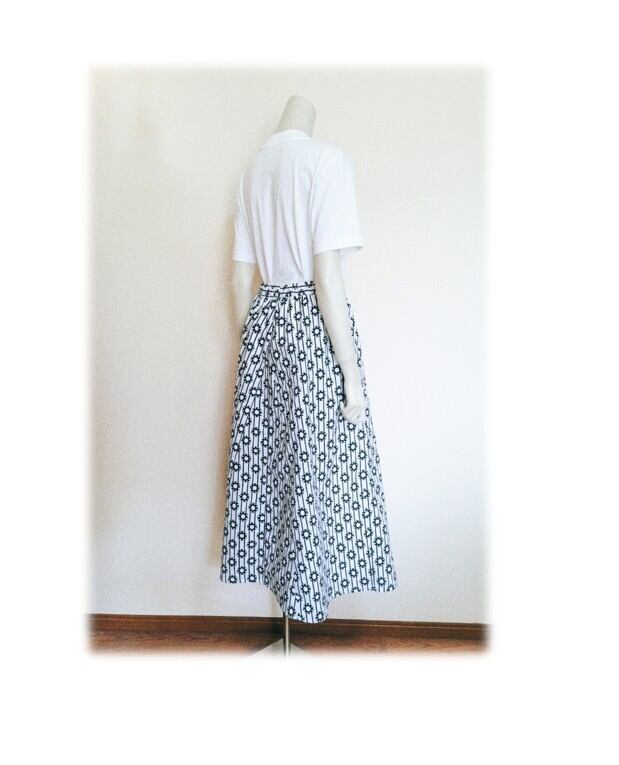 白地に紺のストライプに地図記号のようなユニークな柄、