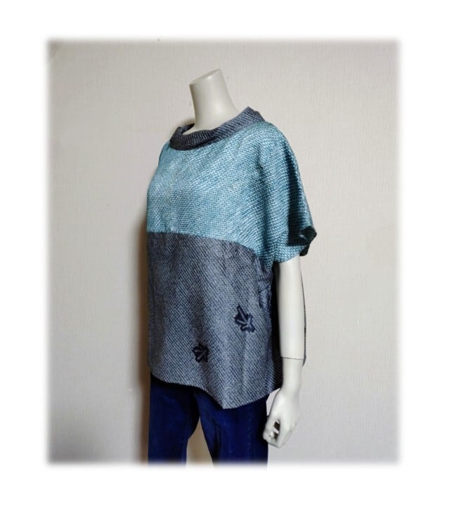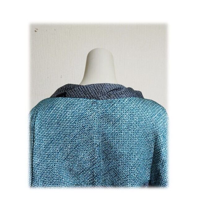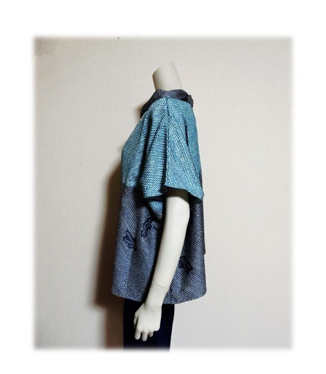 ブルーグリーンとグレーの総絞り羽織をリメイクした、