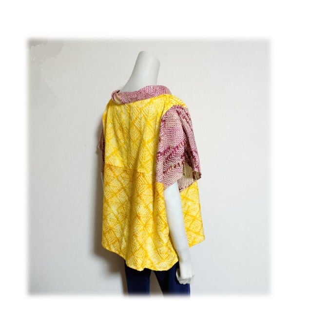 鮮やかな黄色とワイン色系の総絞り羽織をリメイクした、