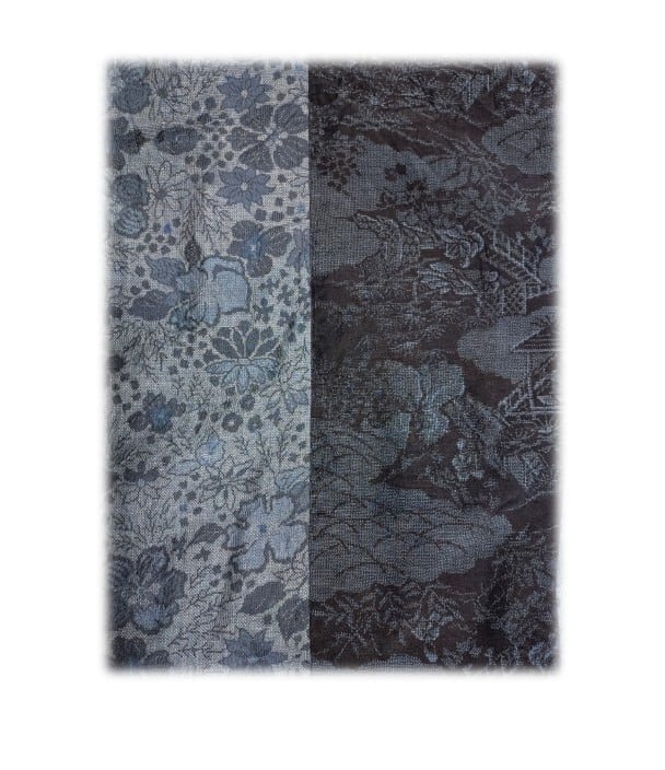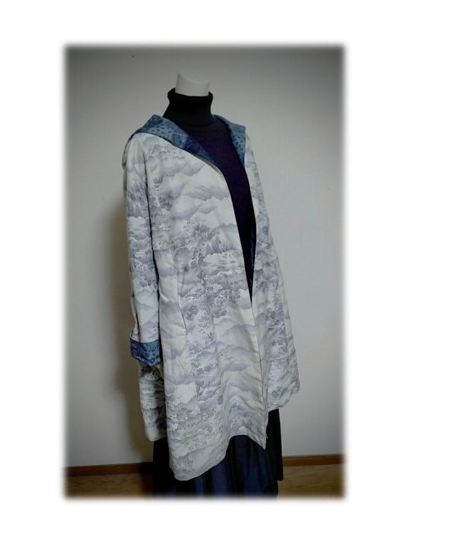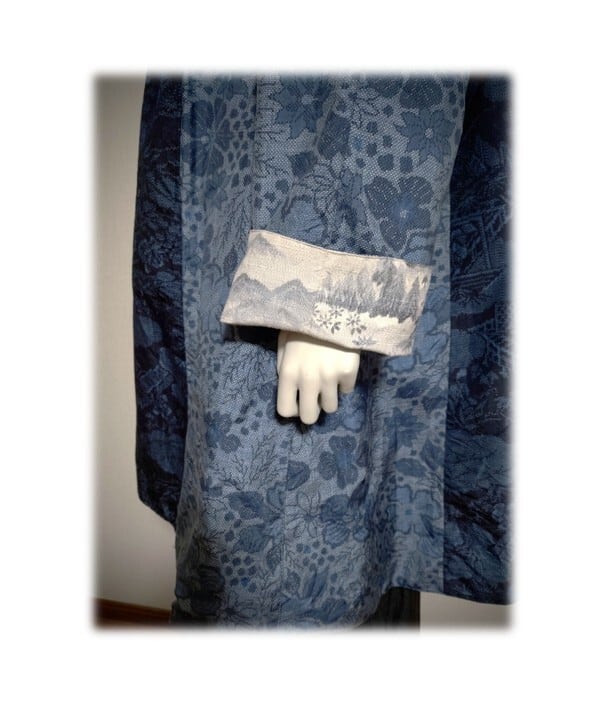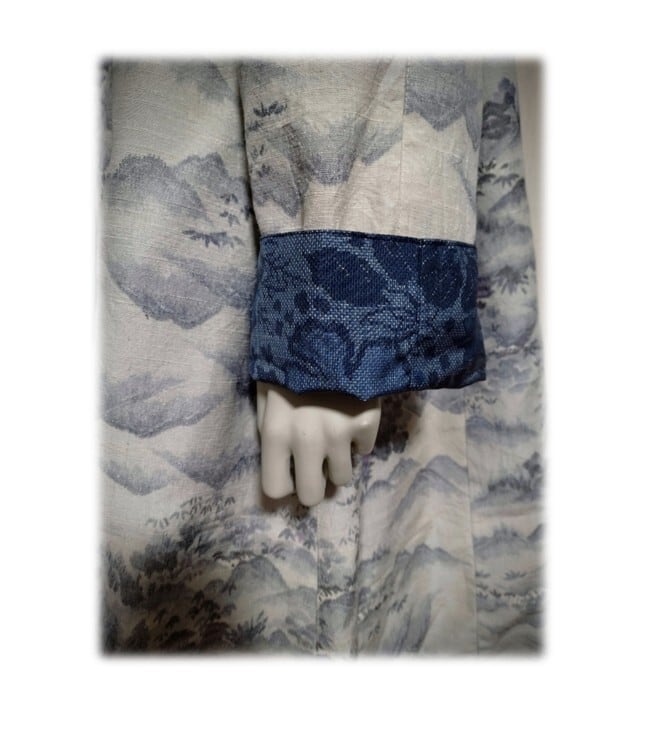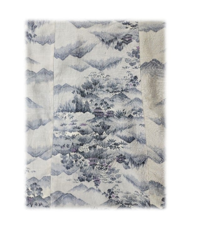 片面は、オフホワイト系地にグレイの景色柄の大島、