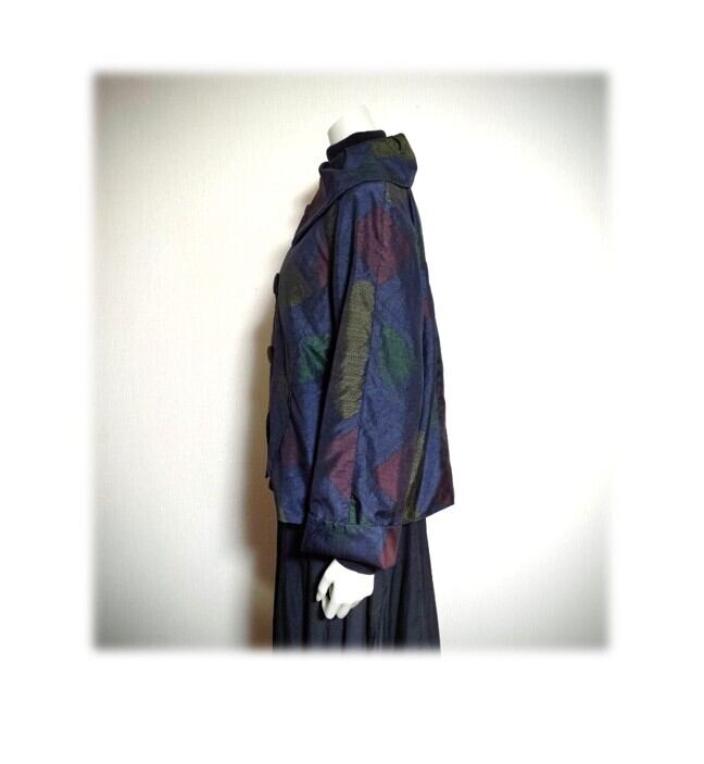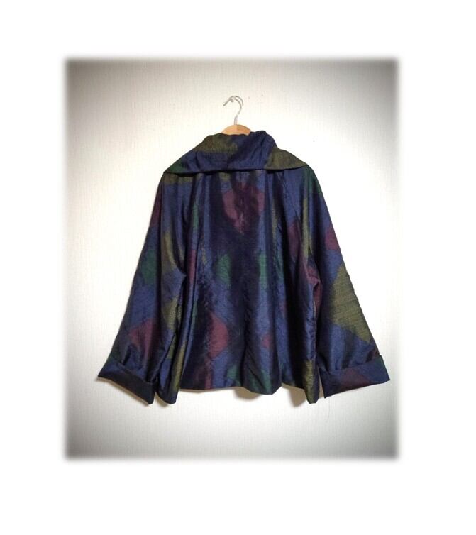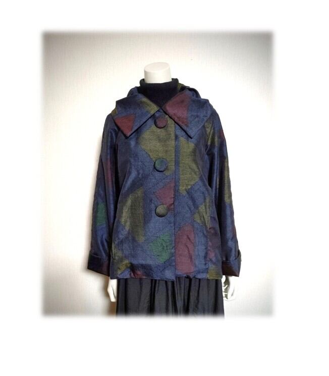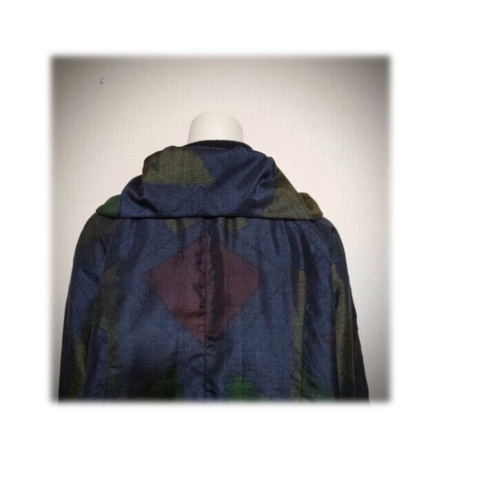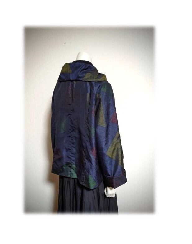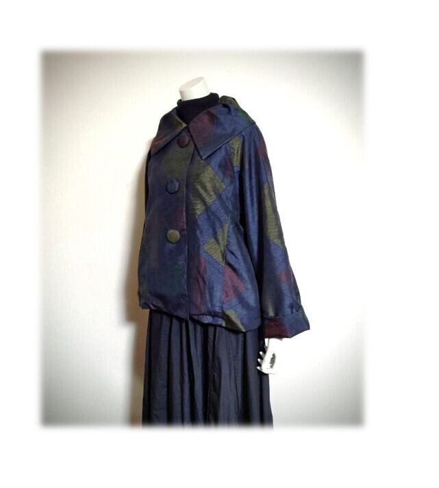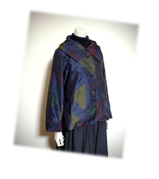 45*大島紬 新作 ジャケット 昭和レトロ 着物リメイク 三角柄 紺色
