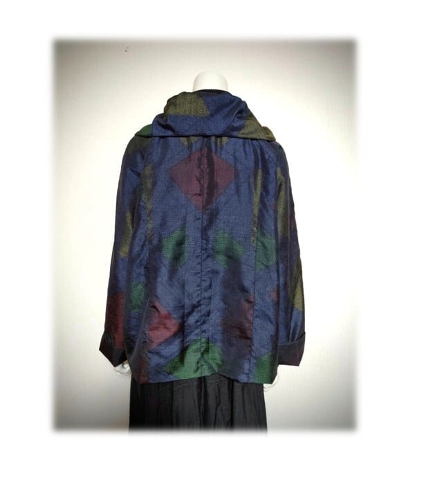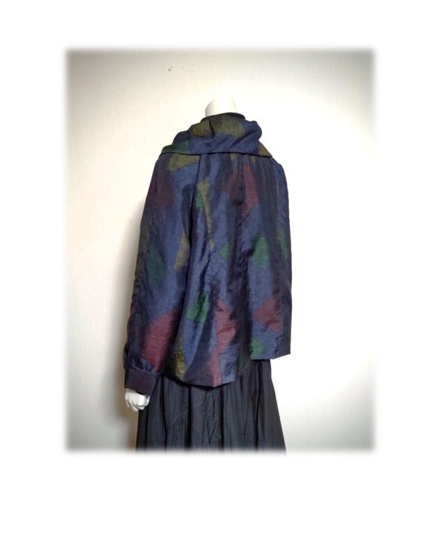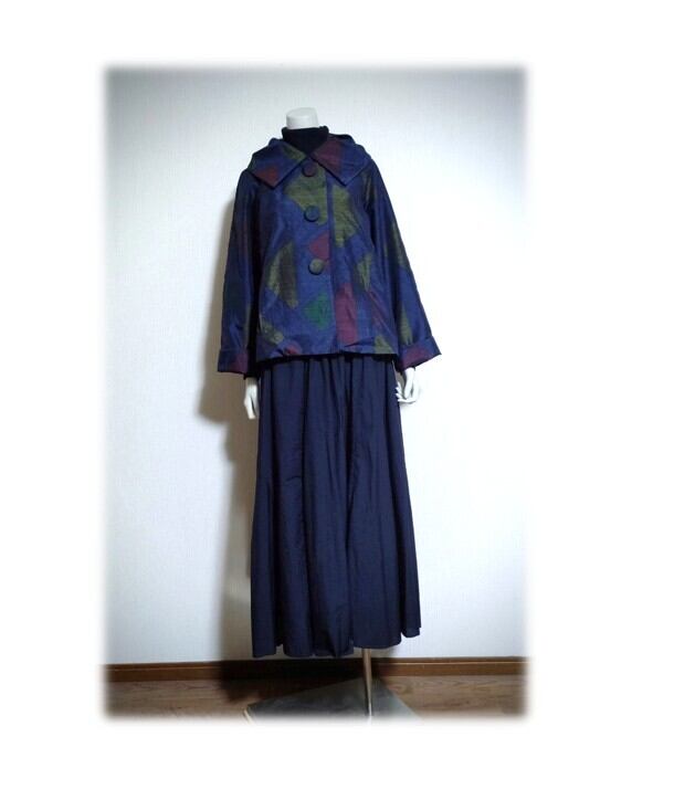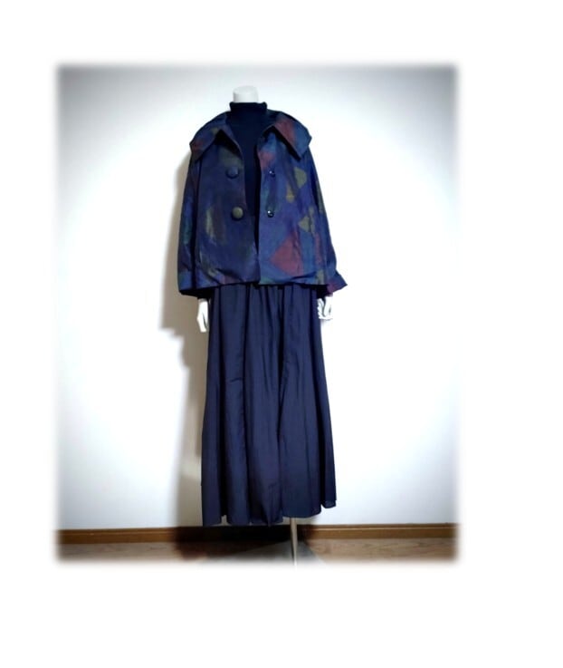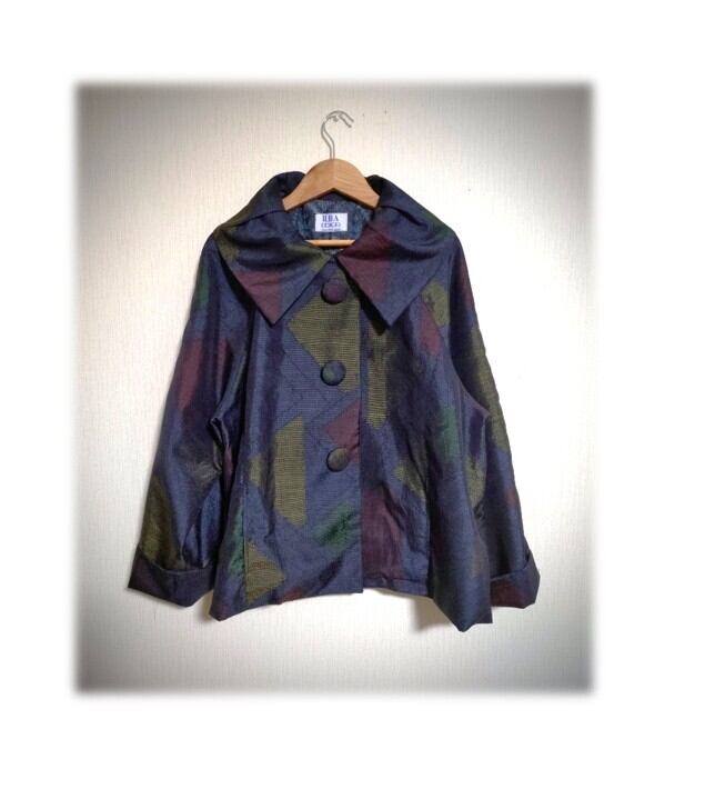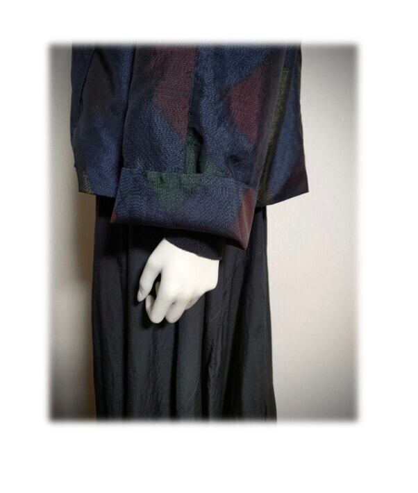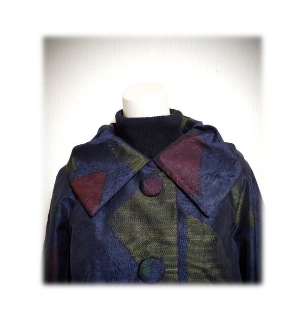 45*大島紬 新作 ジャケット 昭和レトロ 着物リメイク 三角柄 紺色