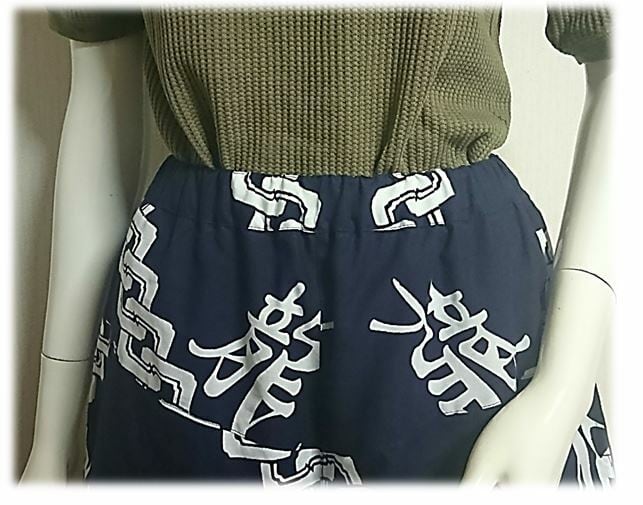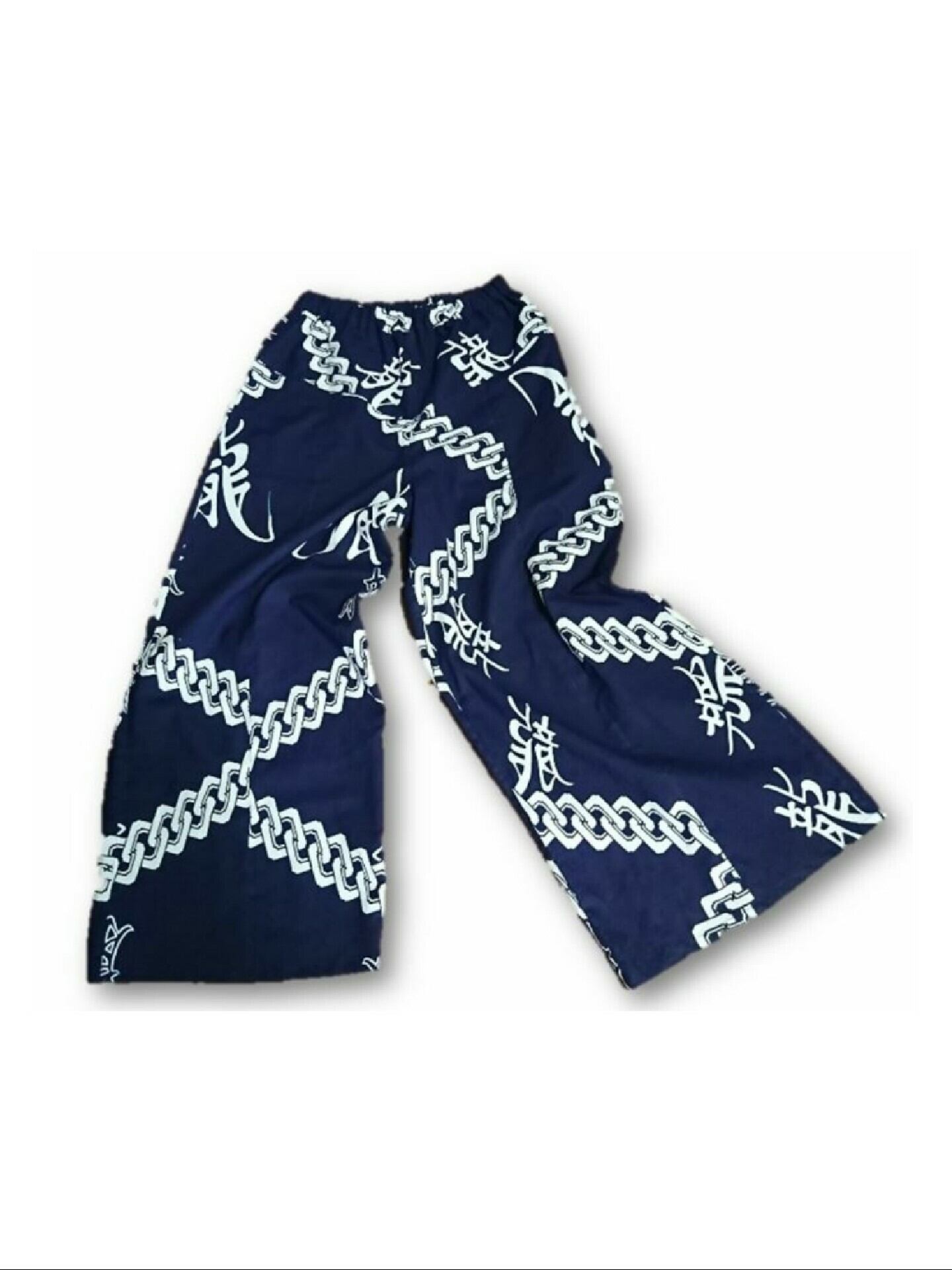 漢字の龍と綱の柄が濃紺に白で染め抜かれた、カッコいいパンツです。