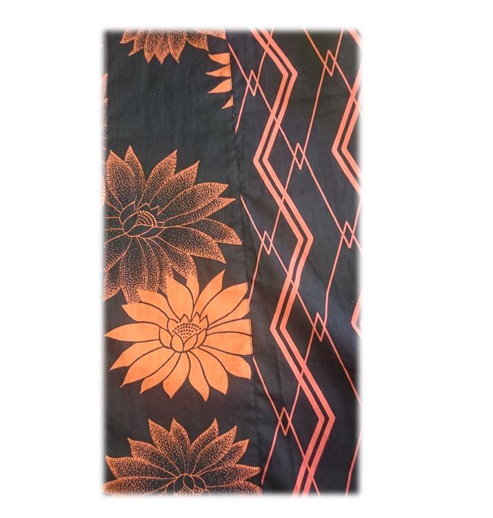 黒地にオレンジのジオメトリックな柄の浴衣と大きな蓮の花の柄の
