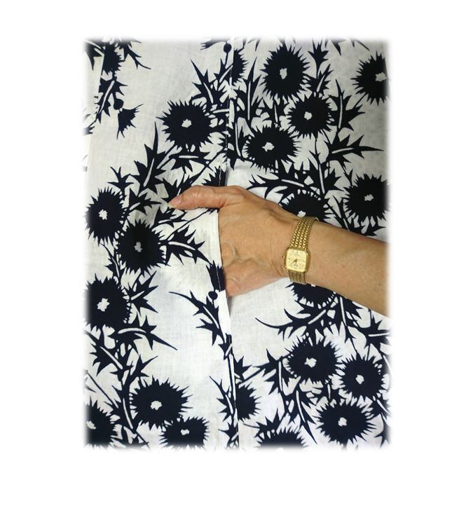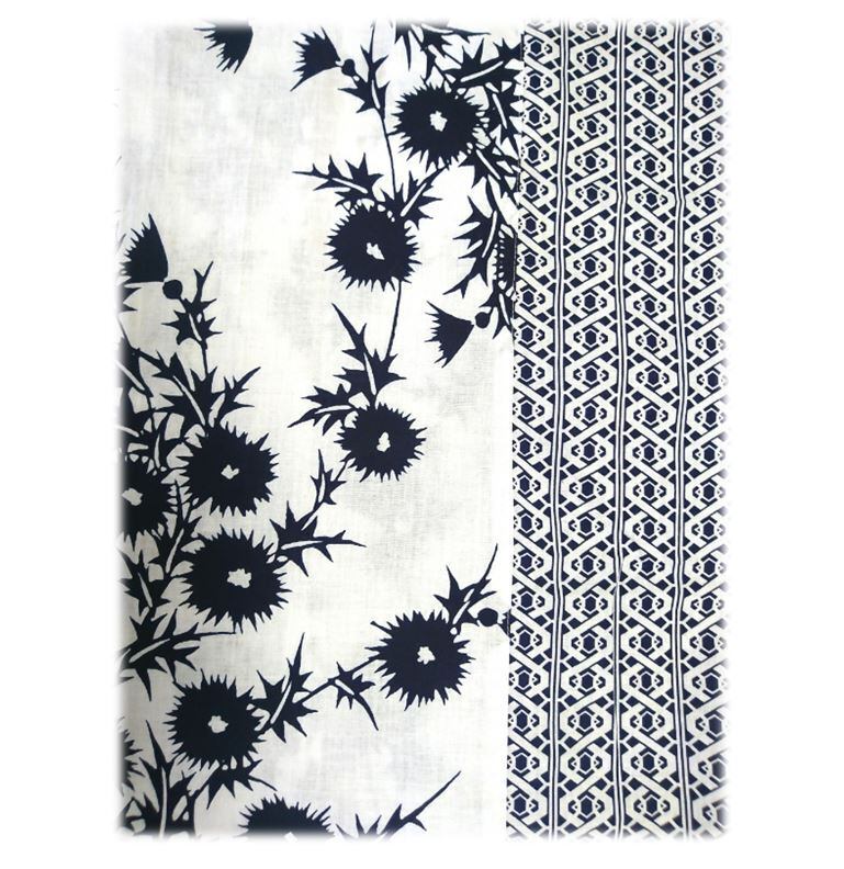 幾何学風な柄の男性物着物を使い、その他はアザミのような花柄の