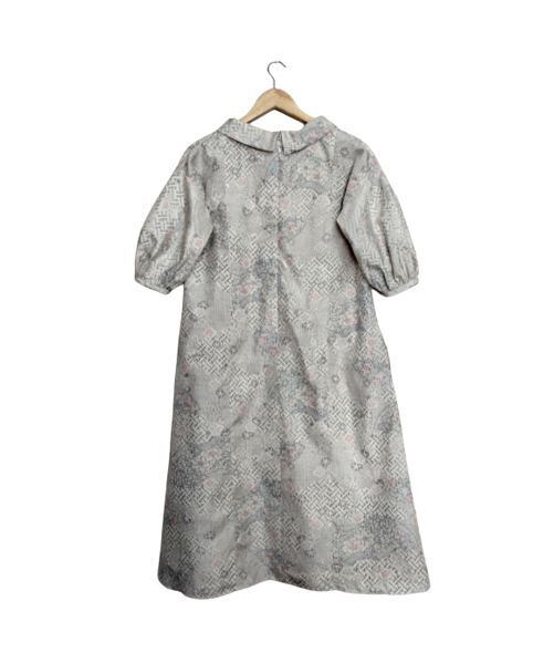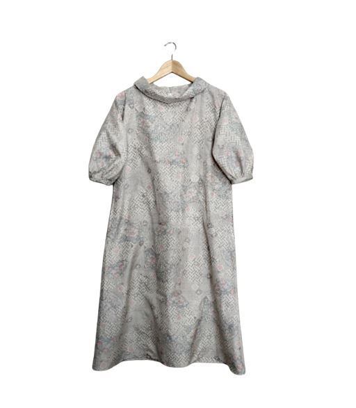 288 白大島着物リメイクレトロ衿Aラインワンピーㇲ(白/花など可愛い柄)