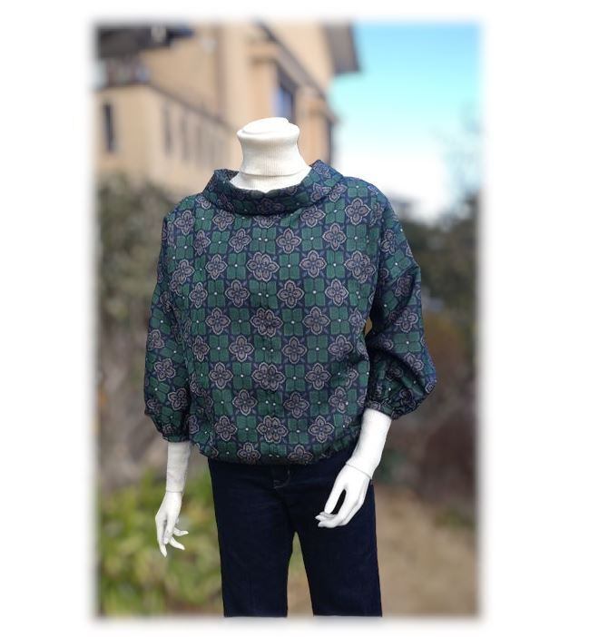ブラウスは、1950年代風のファネルネックで、レトロなデザイン。