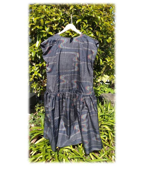 295 村山大島紬 フレンチスリーブワンピース ローウェストワンピース キーネック 着物アップサイクル ウェストマーク