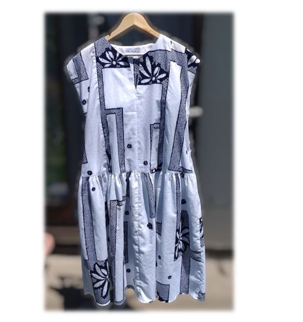 320 訳あり フレンチスリーブワンピース デッドストック衣地 ローウェスト キーネック ゆったりサイズ 夏祭り 花火 白 楽チン ウェストマーク 綿 コットン