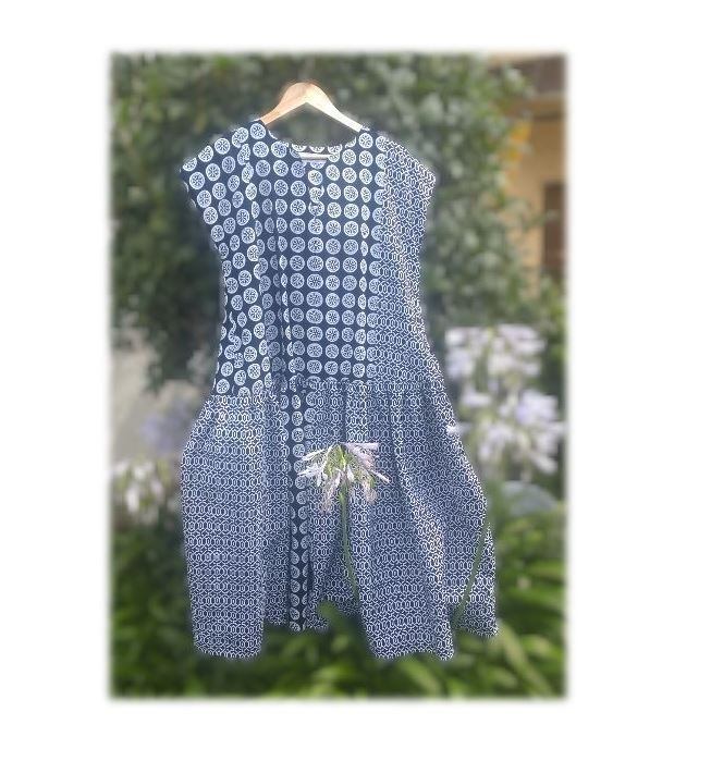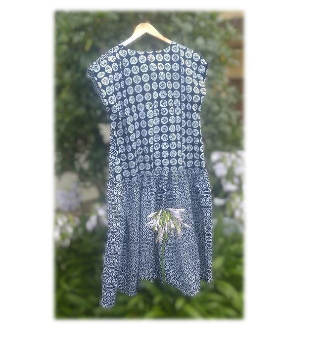 321 訳あり フレンチスリーブワンピース 浴衣リメイク ローウェスト キーネック ゆったりサイズ 夏祭り 花火 紺色 楽チン ウェストマーク 綿 コットン