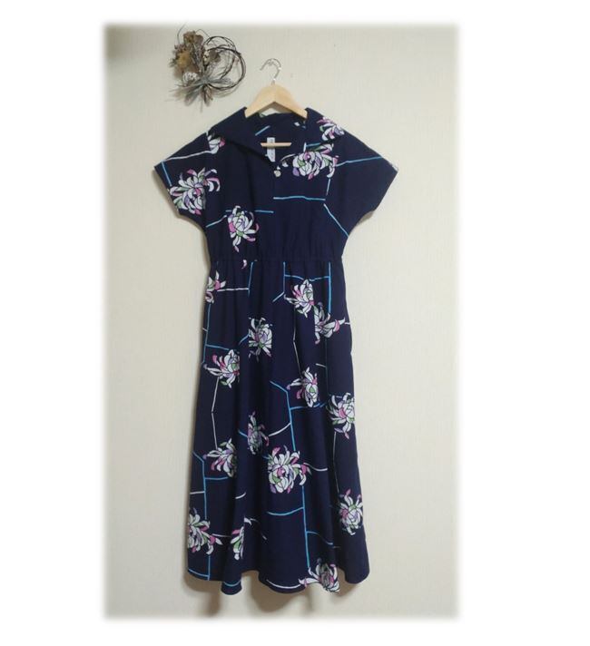 326 抜き衿レトロワンピース デッドストック浴衣地 昭和レトロ イタリアンカラ― 菊柄 紺色 ウェストゴム
