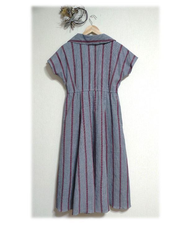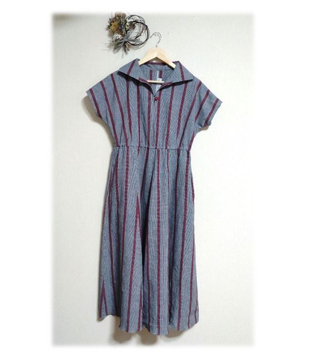 327 抜き衿レトロワンピース デッドストックしじら織り浴衣地 昭和レトロ イタリアンカラ― グレイ×赤 ストライプ ウェストゴム