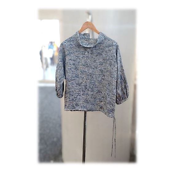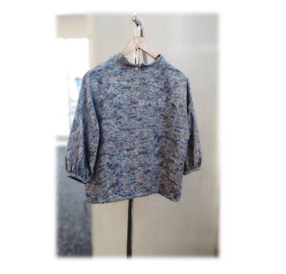 86 プルオーバーブラウス 1点物 スタンドカラー 小紋柄 デッドストック着物地 レトロ 七分袖 ドローストリング ブルーグレー系