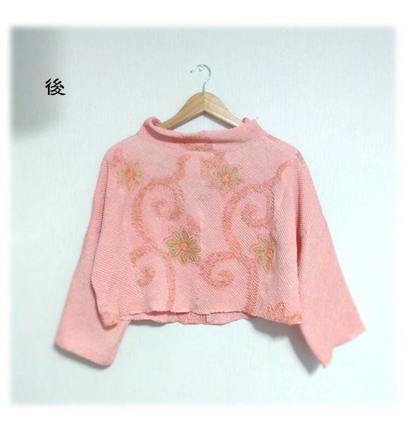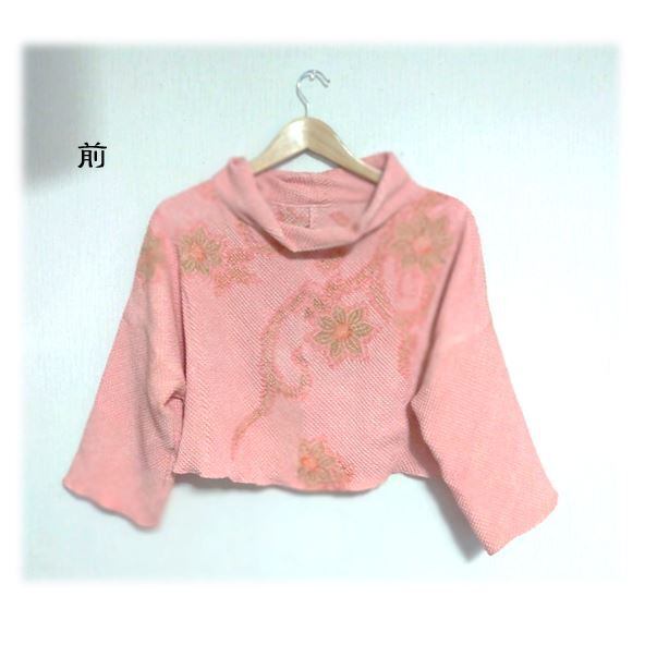 89 1点物 ツイストタートルプルオーバー クロップド丈 総絞 ピンク 着物リメイク 正絹 ゆったり