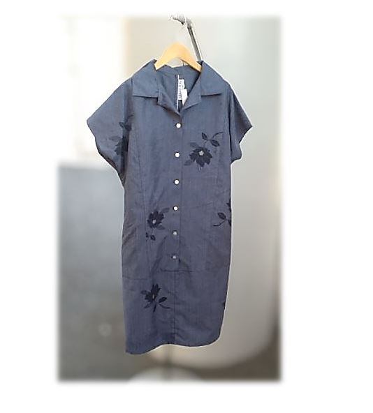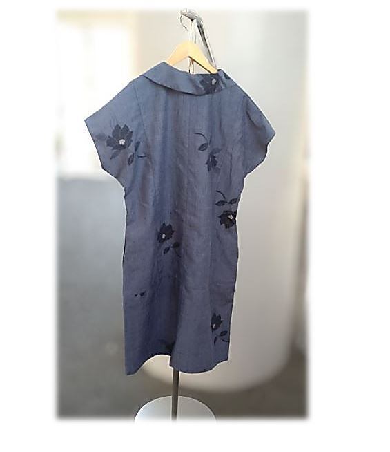 353 1点物 世界に1着 大島紬 Hラインワンピース 前開き 抜き衿 60年代 デニム風カラ― 椿柄 正絹