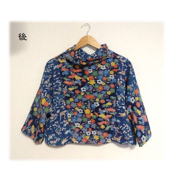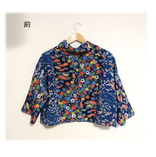88 1点物 プルオーバー 着物リメイク ねじりオフタートル クロップド丈 カラフル 紺系 レイヤード 春物 小紋柄