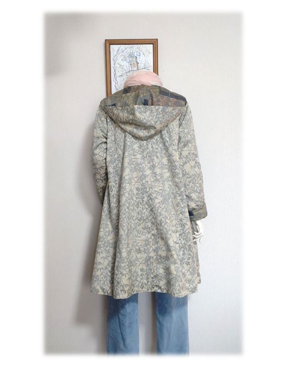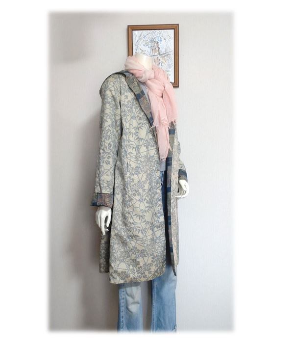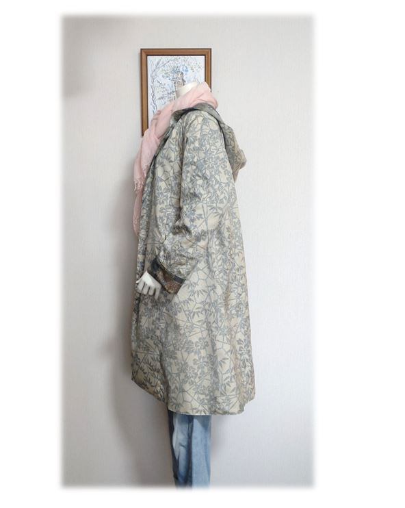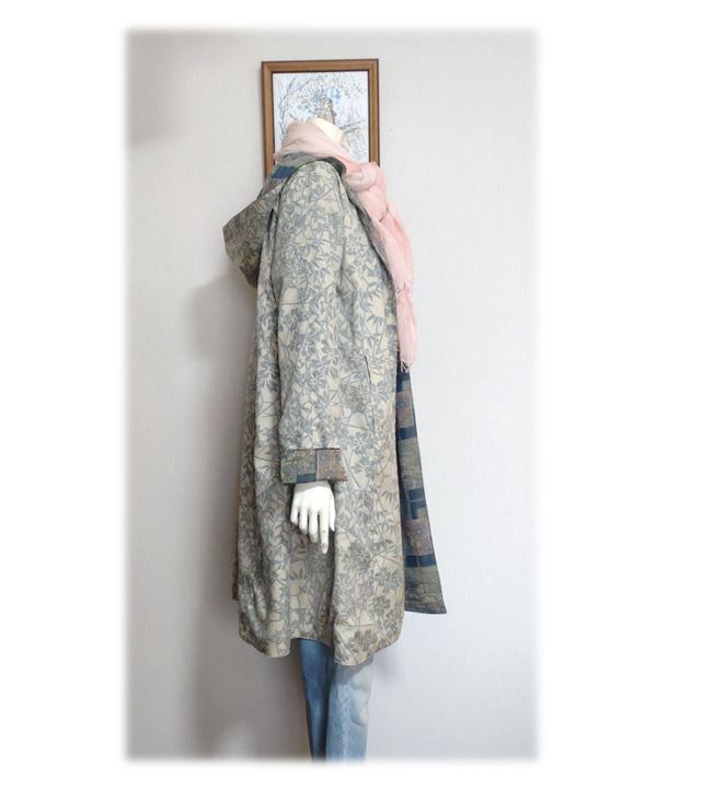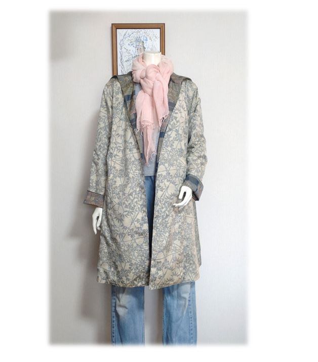 もうクリーム色にグレーの花の総柄の大島紬を使っています。