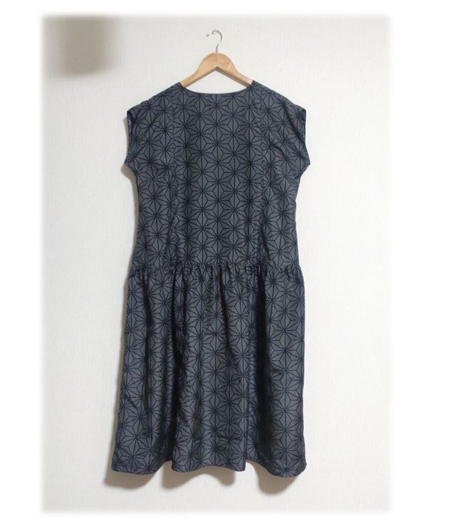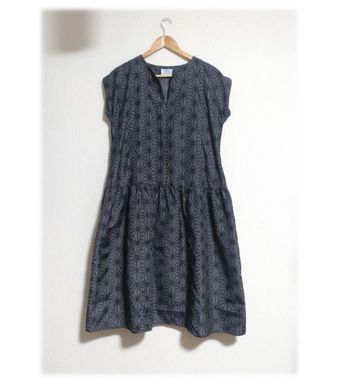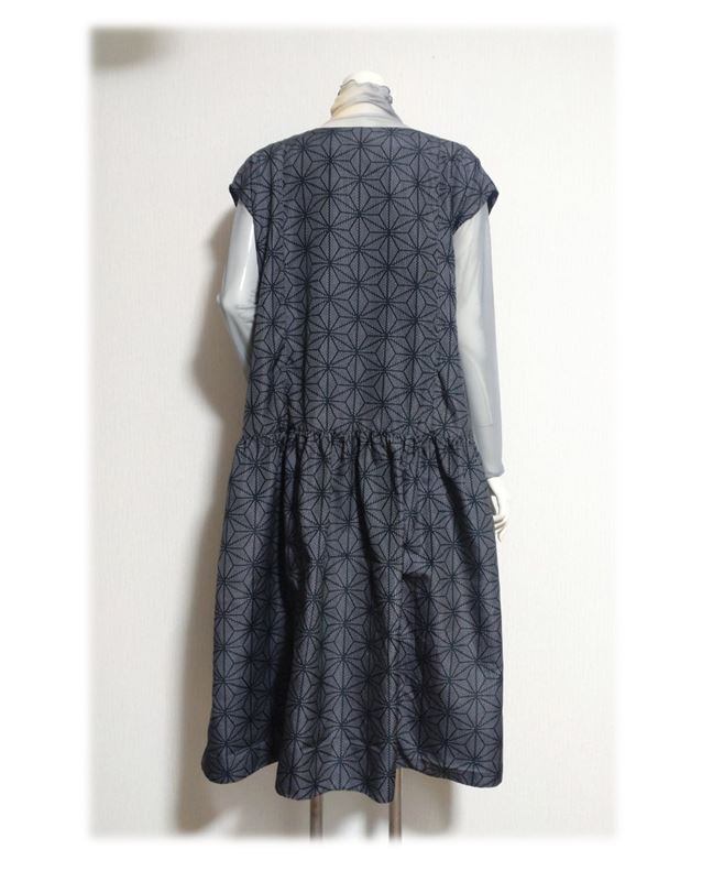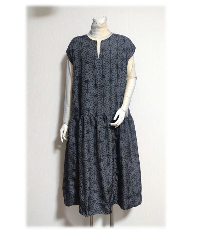 372 1点物 大島紬リメイク キーネックフレンチスリーブワンピース ジャンパースカート 大島紬リメイク ゆったりサイズ 麻の葉繋ぎ 黒 オールシーズン