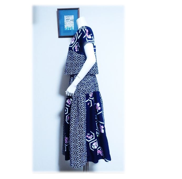 44 ツーピース デッドストック 2種類の浴衣地 1点物 亀甲と花柄 フレアスカート クロップド丈プルオーバー 夏